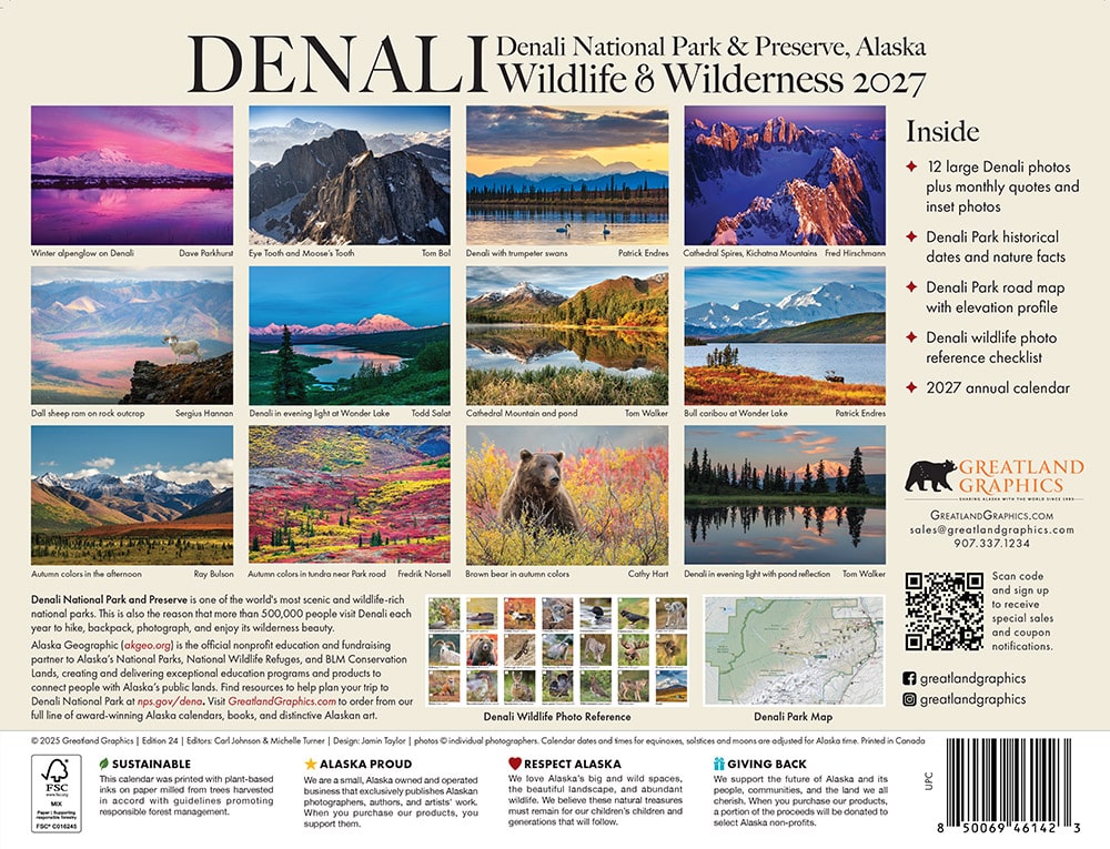 Denali National Park is one of the most visited places in Alaska for its astounding natural beauty and famous wildlife. The elegantly designed calendar features beautiful landscape and wildlife images from Denali National park, taken by Alaska’s top photographers. Alaska-made and printed in Canada by a facility powered with renewable energy and printed on paper that meets the Forest Stewardship Council (FSC) guidelines, which seek to promote responsible management of the world’s forests.