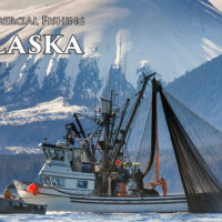 A purse seine commercial fishing boat operates in the coast off of Sitka, Alaska, with Mt. Edgecumbe in the background.
