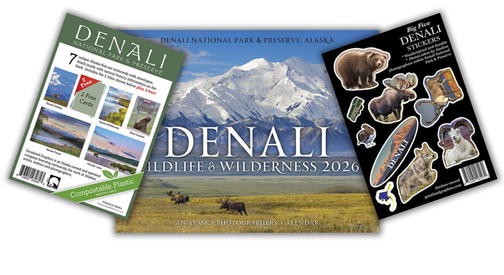 For those who love Alaska’s most-visited national park, we created this bundle of our best Denali products. For this special price, you will receive one Denali Wildlife & Wilderness wall calendar, the Denali Sticker Sheet (featuring the Denali “Big Five”), and the Denali Card Pack (including seven stunning photographic note cards featuring Denali scenery and wildlife). Bundled together, this is marked down 30% off the regular price of these items separately.