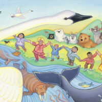 This painting comes from a book that explores how we, both humans and animals, are all in this together. Despite our differences, we all share the world and need to take care of it for each other.