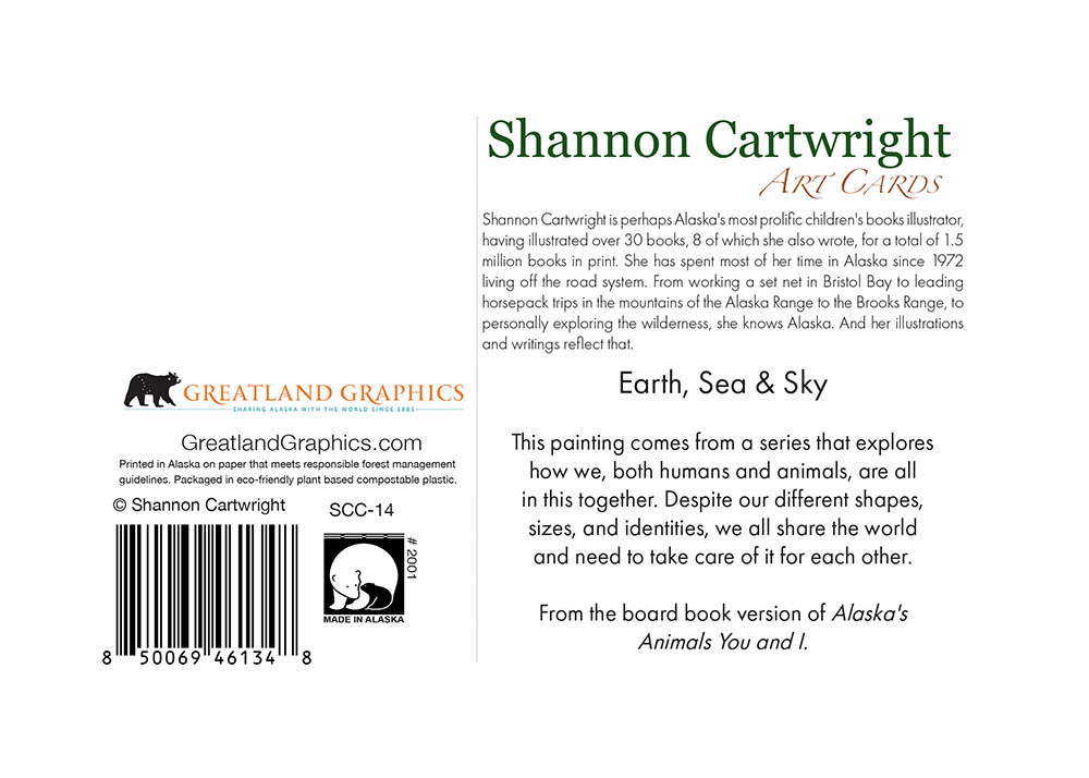 Shannon Cartwright is perhaps Alaska’s most prolific children’s books illustrator, having illustrated over 30 books, 8 of which she also wrote, for a total of 1.5 million books in print. She has spent most of her time in Alaska since 1972 living off the road system. From working a set net in Bristol Bay, to leading horsepack trips in the mountains of the Alaska Range to the Brooks Range, to personally exploring the wilderness, she knows Alaska and her illustrations and writings reflect that.