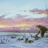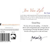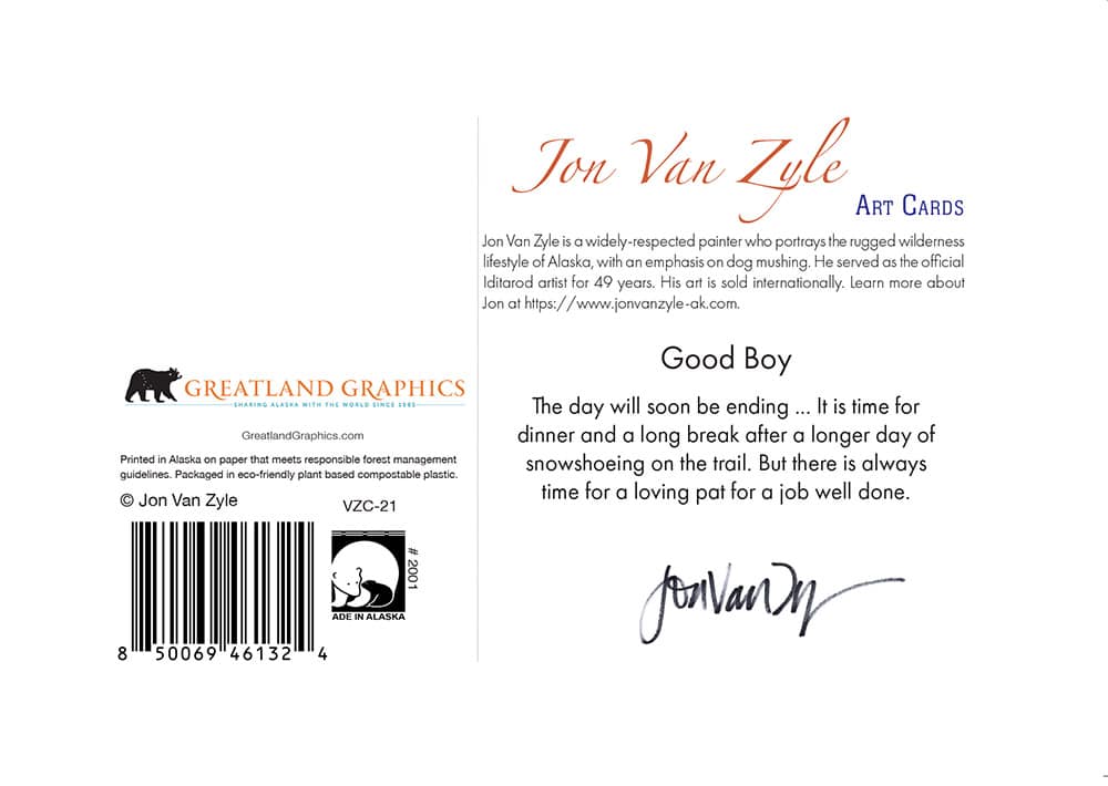 Jon Van Zyle describes his motivation for this painting: “The day will soon be ending … It is time for dinner and a long break after a longer day of snowshoeing on the trail. But there is always time for a loving pat for a job well done.”