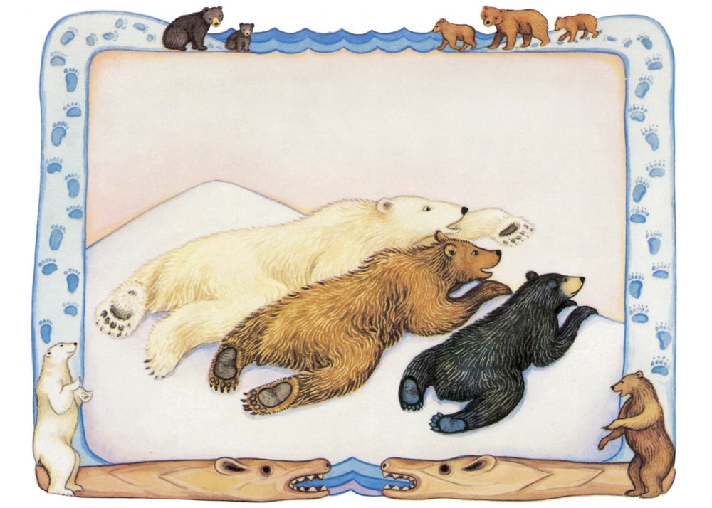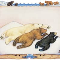The three bears – black, polar, and brown bear – look over Alaska before getting ready to find their forever homes. While they all start their journey together to find their homes, the polar bear chooses the polar region, brown bear chooses the salmon stream, and black bear chooses the berries.