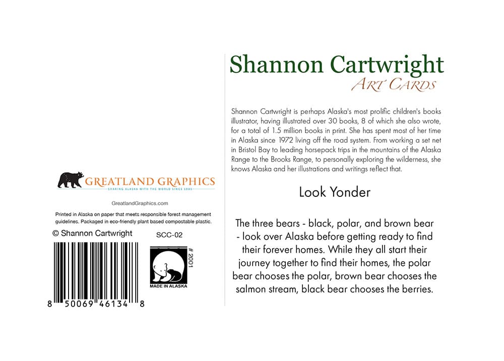 Shannon Cartwright is perhaps Alaska’s most prolific children’s books illustrator, having illustrated over 30 books, 8 of which she also wrote, for a total of 1.5 million books in print. She has spent most of her time in Alaska since 1972 living off the road system. From working a set net in Bristol Bay, to leading horsepack trips in the mountains of the Alaska Range to the Brooks Range, to personally exploring the wilderness, she knows Alaska and her illustrations and writings reflect that.