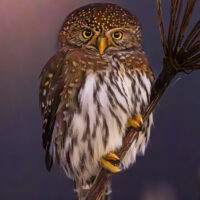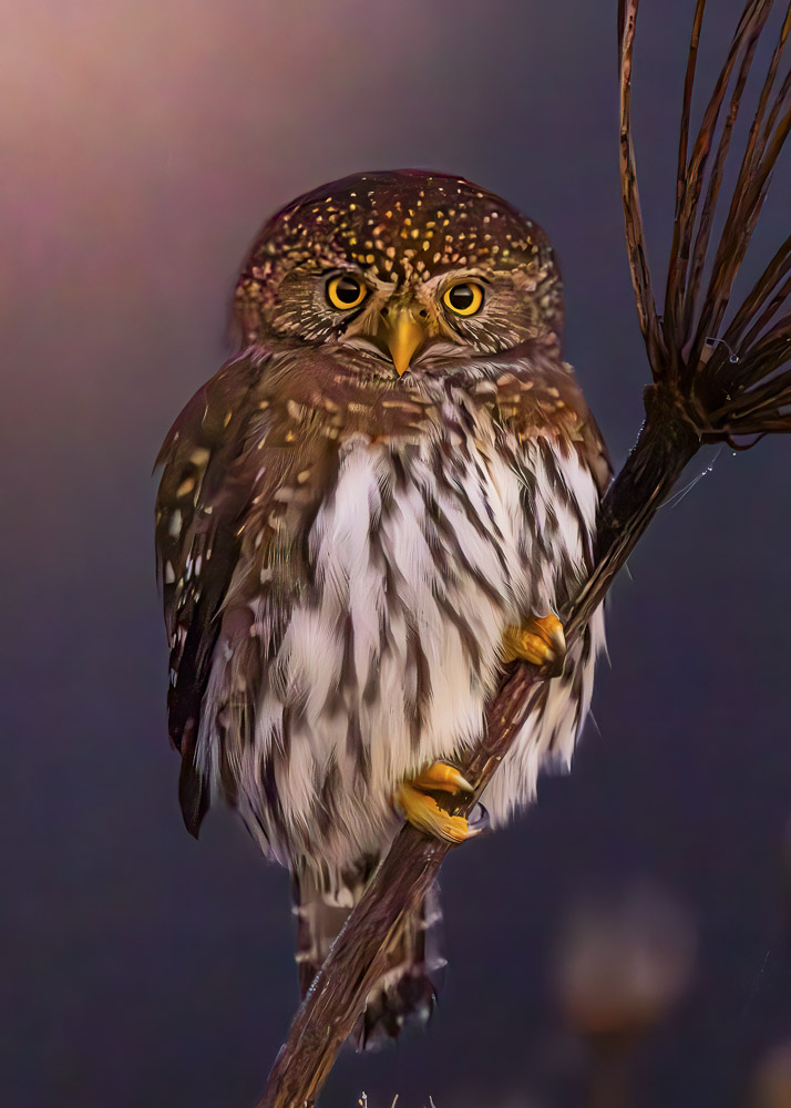 A northern pygmy owl rests on a frosty plant husk in early winter at the Mendenhall Wetlands State Game Refuge, Juneau, Alaska. The northern pygmy owl is small, diurnal raptor known for “eye spots” on the back of the head, which confuses predators and songbirds. They are prolific hunters, sometimes even taking prey larger than themselves. Unlike other owls, they are not silent fliers and have a unique hunting style with an undulating flight pattern.