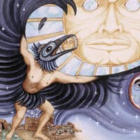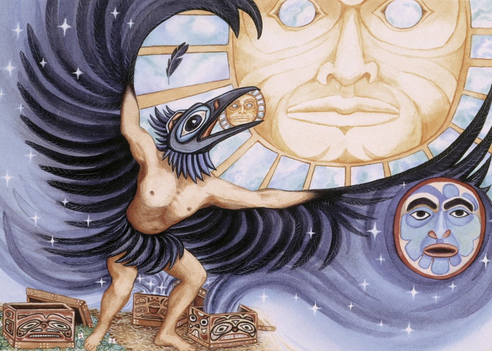Raven divided the night from the day, stealing the sun, moon, and stars from the heavens and bringing them down to the Earth. This way, Earth could have light so that trees could grow, the animals could hunt, and so that Raven’s people could thrive.