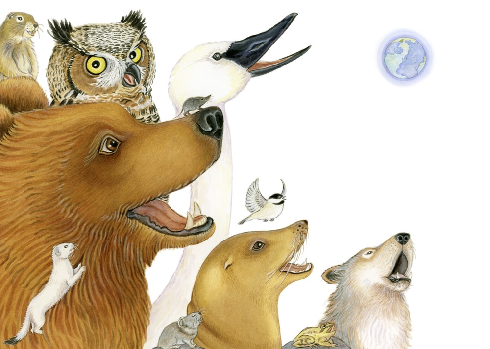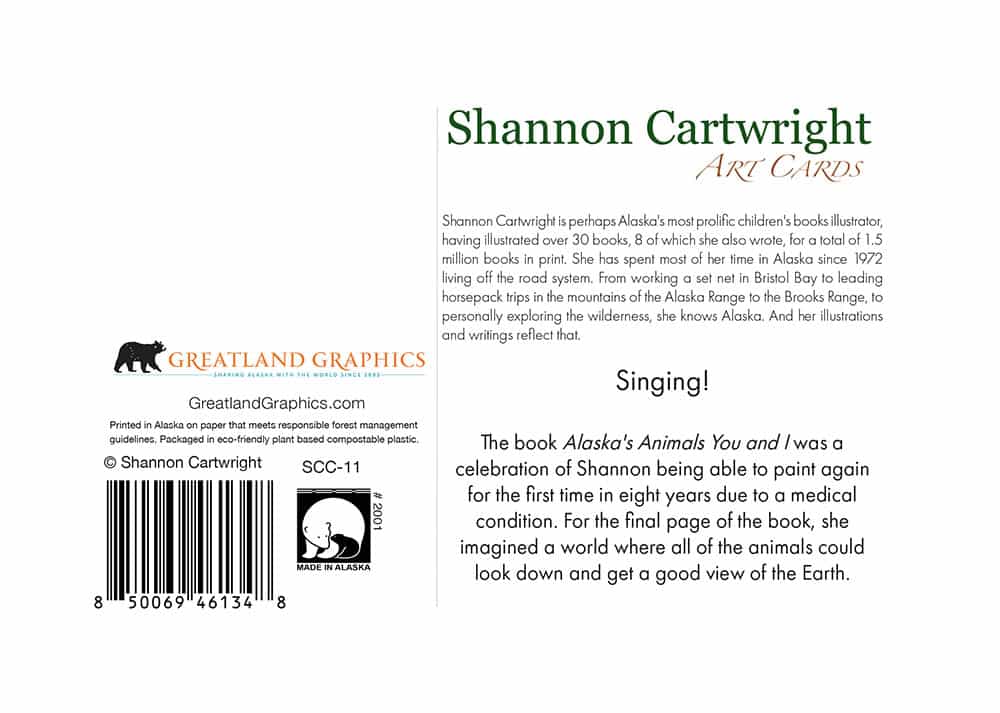 The book Alaska’s Animals You and I was a celebration of Shannon being able to paint again for the first time in eight years due to a medical condition. For the final page of the book, she imagined that all of the animals are singing in celebration of the Earth.
