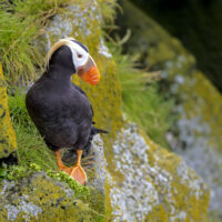 The tufted puffin is one of two puffin species found in coastal areas of Alaska. Unlike the horned puffin, the tufted puffin burrows to nest in the ground, prefers coastal areas, and does not have as northern of a range as horned puffins. Both are a delight to see and amusing to watch in flight. Here, a tufted puffin seems to be deep in thought high on a rocky outcrop amidst some moss and grasses.
