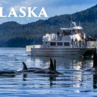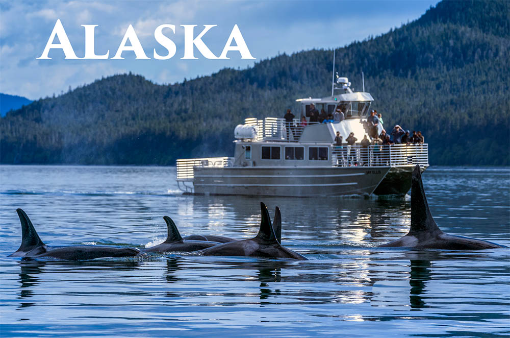 Tour boat in the Inside Passage enjoying a view of a pod of Orcas.